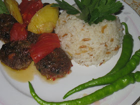 Soğanımızı, sarmısağımızı rendeliyelim. Üzerine kıymamızı, ufalanmış ekmek içi, yumurta ve baharatlarımızı ekleyip iyice yoğuralım. Elimizle yuvarlayarak köfte şekline getirelim.  Fırın tepsisine dizelim. Domates ve patateslerimizi dilimleyip köftelerin arasına yerleştirelim. Salçamızı eritelim. Köftelerimizin üzerine gezdirelim. Tuz serpip tereyağımızı ilave edip önceden ısıtılmış fırında pişirelim. Servis tabaklarına alıp afiyetle yiyelim.